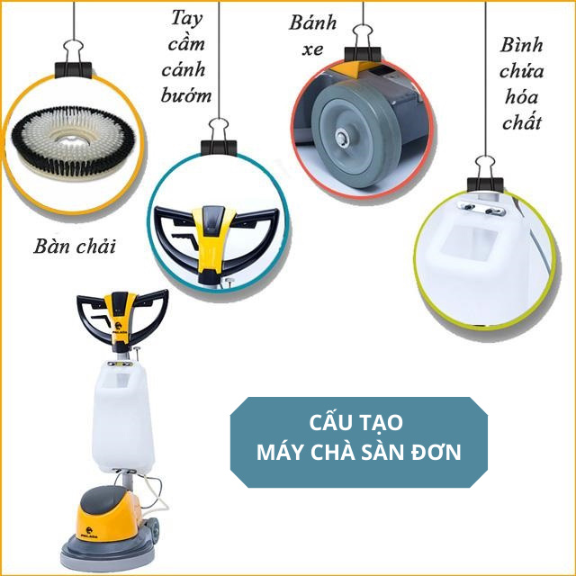Ở cả máy chà sàn đơn và máy chà sàn liên hợp đều có các bộ phận cấu tạo chính sau :