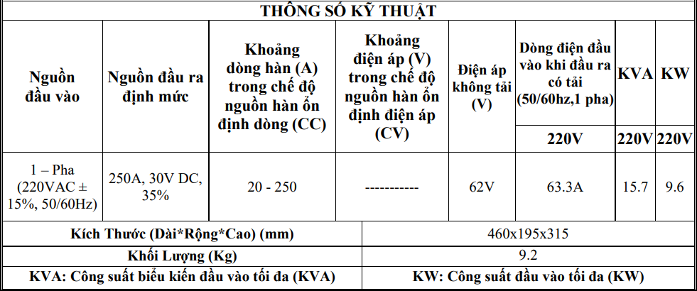 Hiệu suất chu kỳ làm việc đạt tới 35% tại dòng hàn 250A trong điều kiện làm việc 40oC, thiết bị hàn được liên tục trong 3,5 phút tại mức dòng hàn 250A mà không báo quá nhiệt.